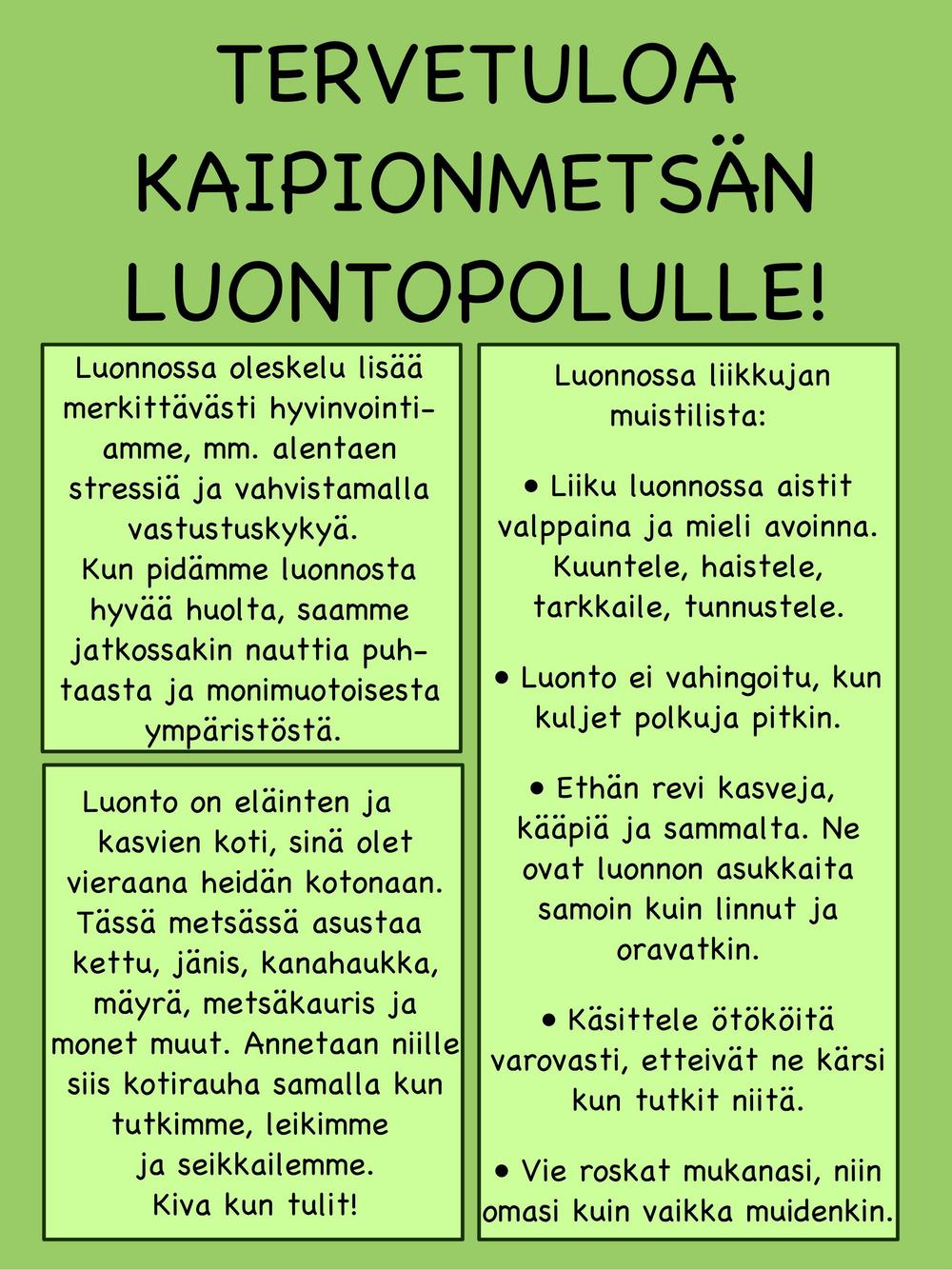 kasveja, maastoa ja eläimiä. Rastien tauluista löydät tietoa luonnosta ja hauskoja tehtäviä,