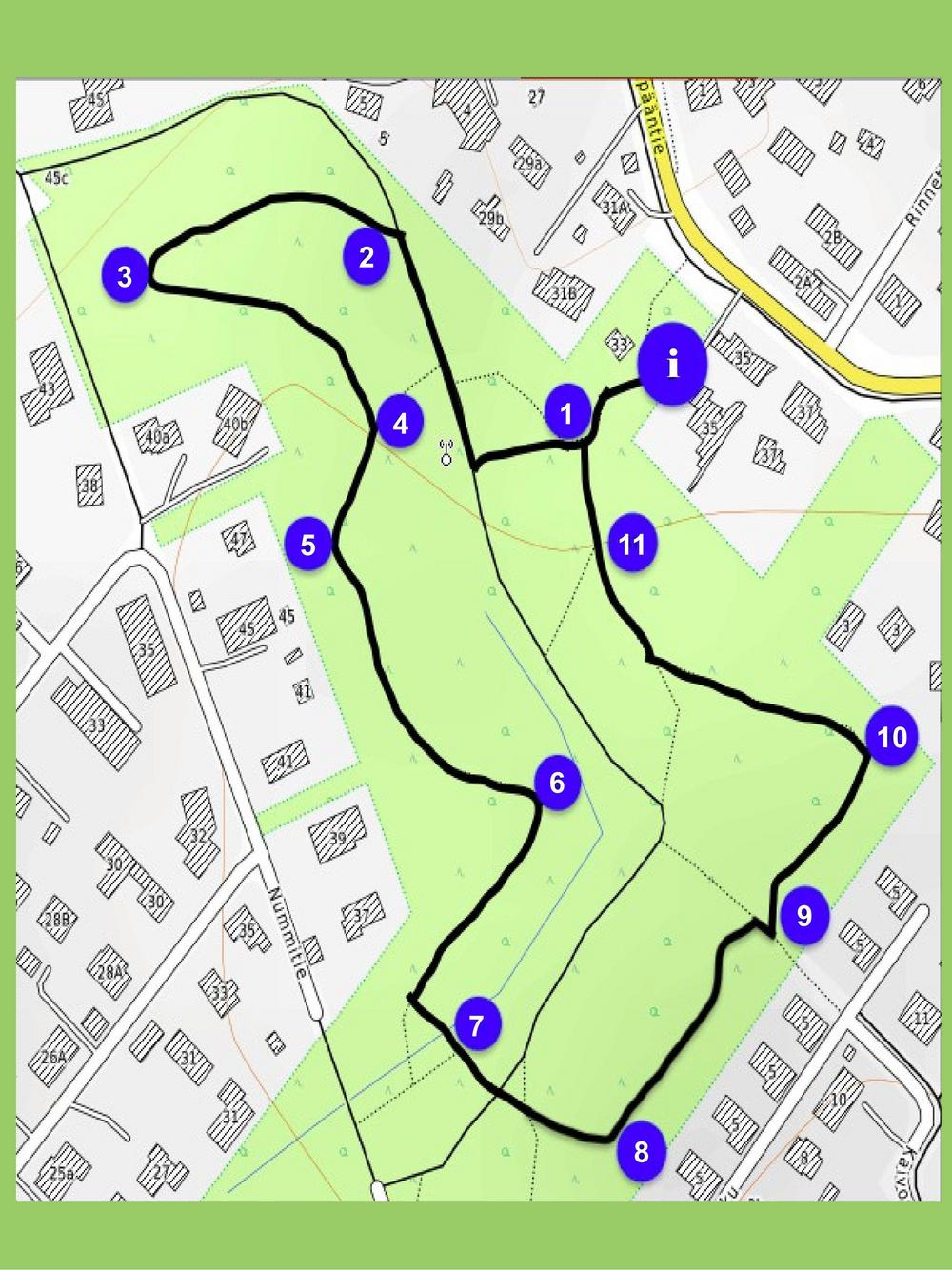 Reitin varrelta löytyy 11 erilaista luontorastia, jotka esittelevät alueen puustoa,