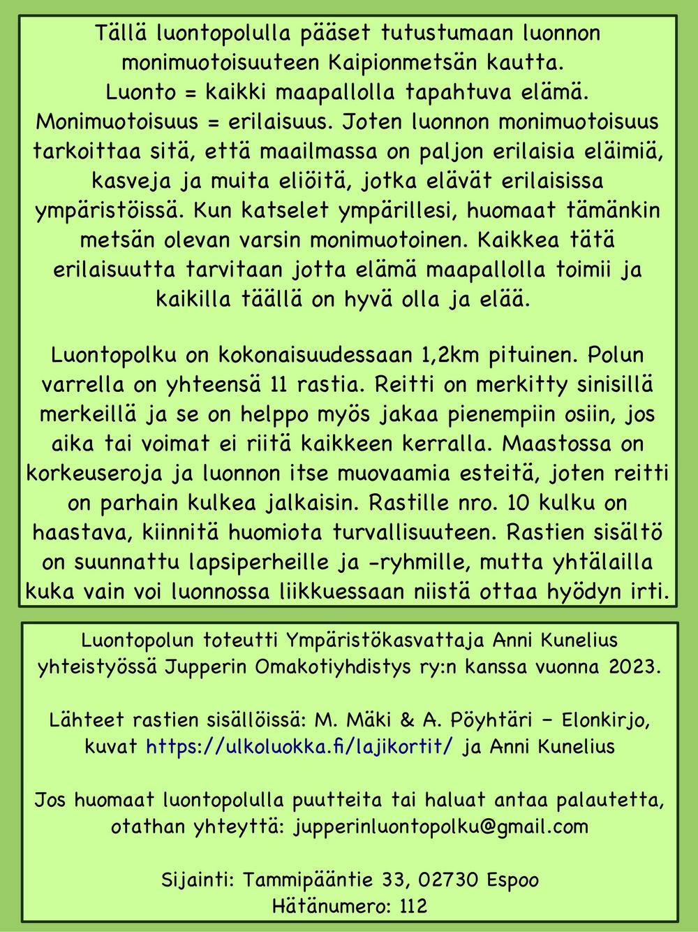 kaikenikäisille sopivan luontopolun. Luontopolun on toteuttanut yhdessä omakotiyhdistyksen